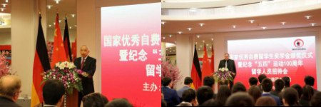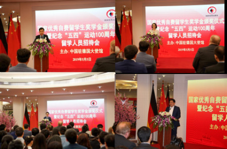 5月5日上午,“2018年度国家优秀自费留学生奖学金”颁奖仪式暨纪念“五四”运动100周年留学人员招待会在驻德国使馆隆重举行。来自全德各地的获奖者及部分家属、评审专家代表、导师代表、“海外选拔国家高水平项目”资助的留学人员,以及来自柏林自由大学、洪堡大学、柏林工业大学的留学人员代表等约100人应邀与会。吴恳大使出席活动并为获奖者颁发证书。