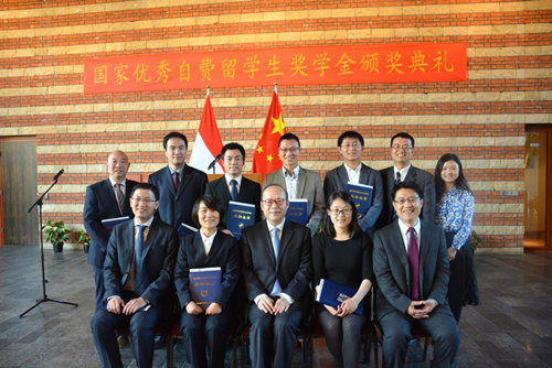 4月14日,中国驻荷使馆教育处举办2015年度“国家优秀自费留学生奖学金”颁奖活动,陈旭大使出席致辞,并为11名获奖同学颁发证书,近80名在荷留学生代表参与。使馆教育处孟庆瑜参赞主持了颁奖仪式。