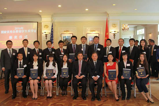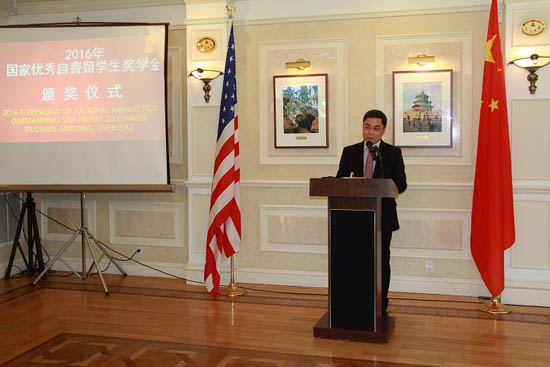 一年一度的“国家优秀自费留学生奖学金”颁奖仪式暨招待会于2016年4月21日在华盛顿驻美使馆教育处举办。李克新公使出席并为获奖学生颁奖,岑建君公参主持颁奖仪式。获奖学生、优秀留学生代表、港澳台留学生代表、导师与评审专家代表、美政府、教育机构代表共150余人参加了活动。